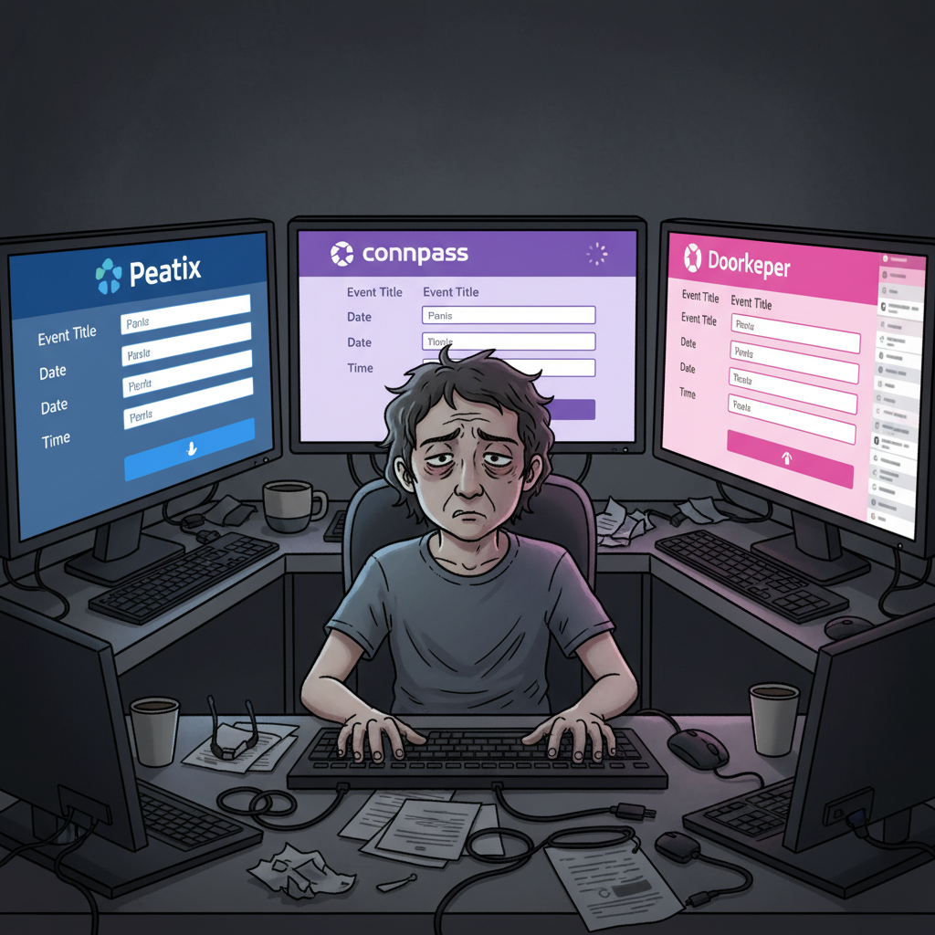 複数プラットフォームでの重複作業、効果の見えない広告費、深夜残業... EventSync ProのAI搭載システムで全て解決します。